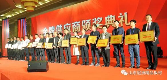 24日晚,在宴会大厅举办的金牌供应商和新产品、新工艺高端品牌颁奖典礼上,冠洲被兰格钢铁网授予“2017年金牌供应商”荣誉称号,冠洲牌高耐蚀彩色涂层钢板和TS550GD高强彩色涂层钢板两个产品,荣获兰格钢铁网评委会颁发的“涂镀板材新产品、新工艺高端品牌”大奖,张培华部长代表公司上台领奖,并发表获奖感言。他说,冠洲产品再获殊荣是兰格钢铁网和广大用户长期支持和认可的结果,对冠洲而言既是鼓励,也是鞭策。展望未来,冠洲人必将积极探索、勇于创新,本着“成为世界级钢铁彩涂板深加工行业的持续领先者”的愿景,以“创新驱动转型升级,引领行业健康发展”为使命,坚持“冠洲质造、冠军品质”的质量理念和“满分服务是基础、超额满意是追求”的服务理念,为中国钢铁添彩!