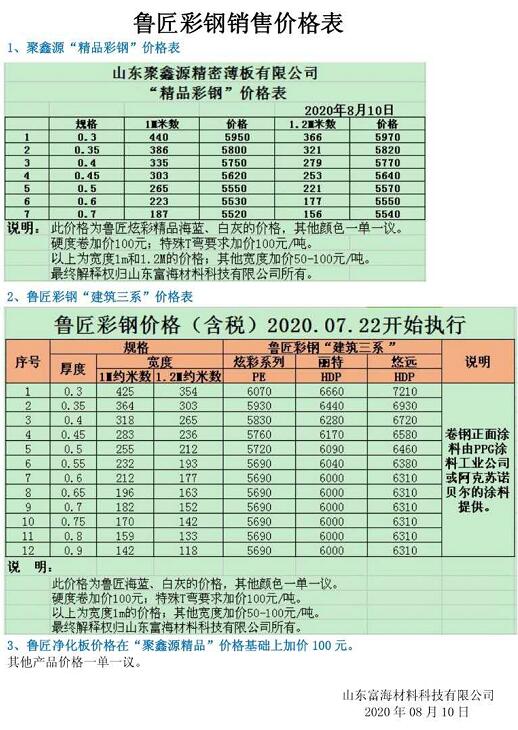 鲁匠彩钢价格销售表(8月10日)