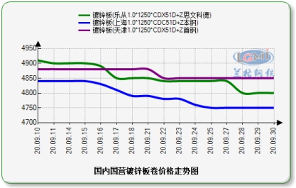 本周(9.27-9.30)涂镀价格弱势下行。据兰格钢铁云商平台市场监测显示,截至9月30日,国内市场1.0mm镀锌平均价格为4748元(吨价,下同),较上周同期价格下调19元;0.47mm彩涂平均价格为6165元,较上周同期价格下调13元。