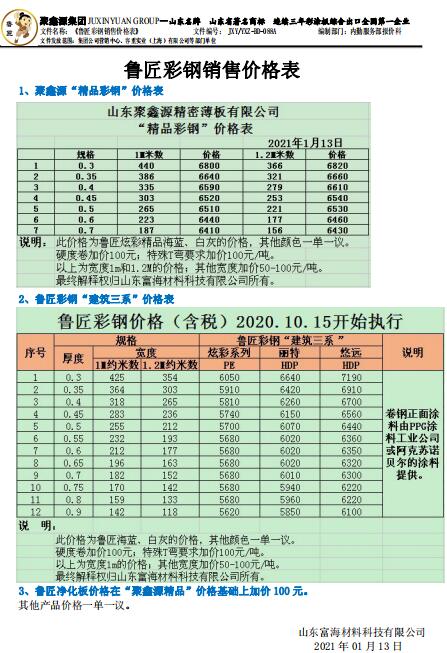 鲁匠彩钢价格销售表(1月13日)