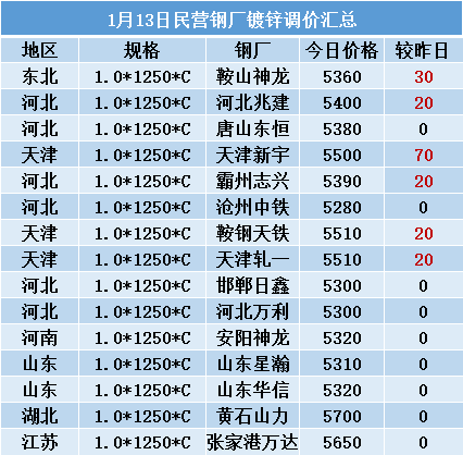 1月13日山东科瑞镀锌板出厂价格上调50元