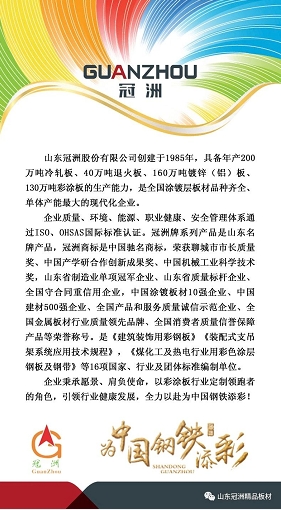 冠洲精品彩涂板是以热镀锌板、镀铝锌板、铝镁锰板、锌铝镁板、不锈钢板等为基板,经过表面预处理,用辊涂的方法,涂上一层或多层液态涂料,经过烘烤、冷却而成。所使用的涂料有聚酯、硅改性聚酯、高耐久性聚酯、聚偏氟乙烯、环氧以及高耐腐蚀性涂料等多种涂料,具有较强的耐久性、抗腐蚀性和成型性,产品广泛应用于汽车、家电、装饰、建筑等行业。
