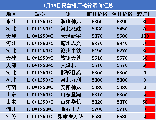 1月19日民营钢厂镀锌调价汇总