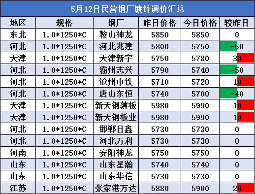 5月12日天津新天钢薄板镀锌出厂价格上调10元
