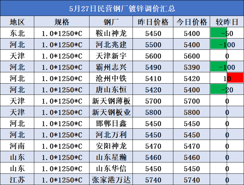5月30日民营钢厂镀锌调价汇总