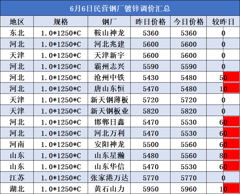 6月6日山东星瀚镀锌板出厂价格上调80元