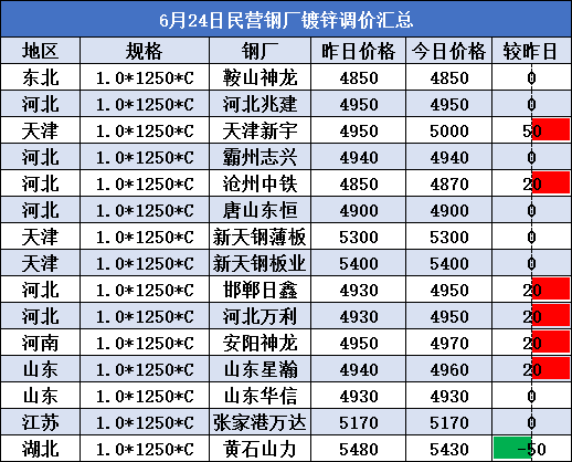 6月24日民营钢厂镀锌调价汇总
