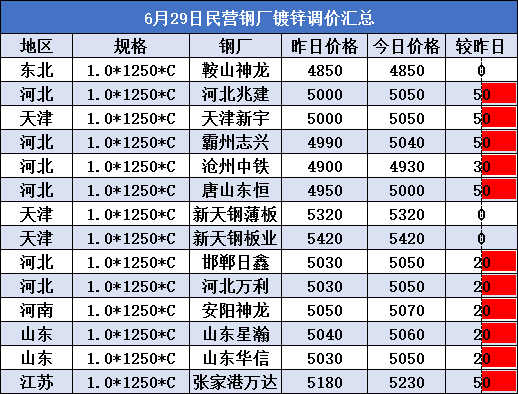 6月29日民营钢厂镀锌调价汇总