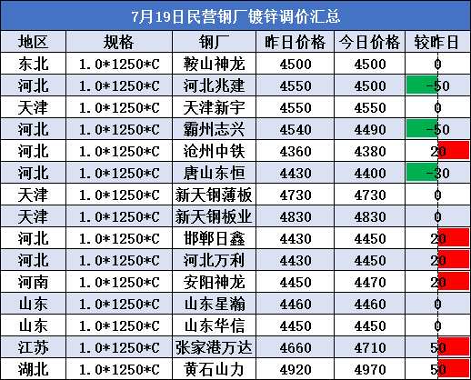 7月19日安阳神龙镀锌板出厂价格上调20元