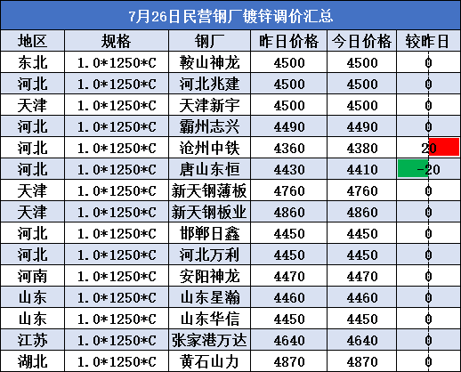 7月26日天津新天钢薄板镀锌出厂价格平稳