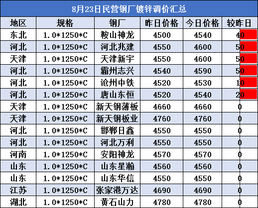 8月23日天津新天钢薄板镀锌出厂价格平稳