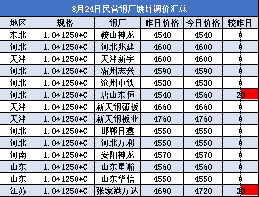 8月24日民营钢厂镀锌调价汇总