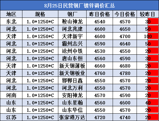 8月25日民营钢厂镀锌调价汇总