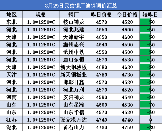 8月29日民营钢厂镀锌调价汇总