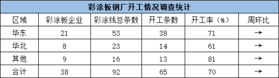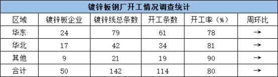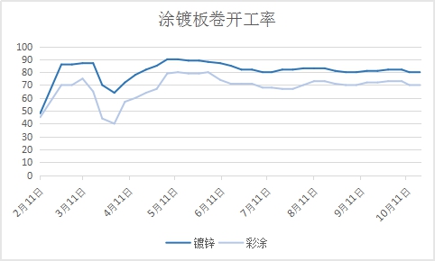 兰格调研:截止10月20日,我网对全国52家钢厂样本进行统计。其中镀锌板生产线共142条,停产或检修28条,开工率为80%;彩涂板生产线共92条,停产或检修27条,开工率为70%。样本数据日均总产量镀锌板8.48万吨,彩涂板2.79万吨。本周开工率基本持平,二十大期间,已有个别钢厂检修,部分区域受疫情反复影响,实行静默管理,交通运输受阻。