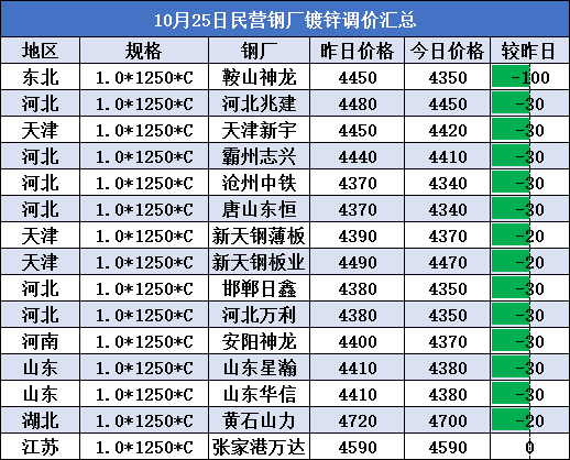 10月25日天津新天钢板业无花镀锌板出厂价格下调20元