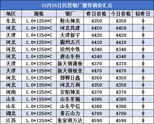 10月26日天津新天钢薄板镀锌出厂价格平稳