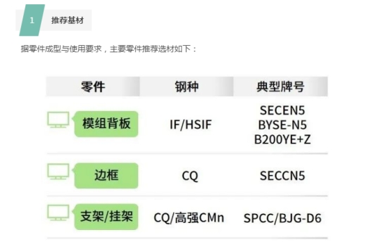 软钢系列SECCN5、SECEN5、BYSE-N5为软钢系列牌号,SECCN5屈服强度延伸率一般,适用于变形相对简单的零件,如只有折弯要求的边框零件;而SECEN5、BYSE-N5用于变形复杂,深拉伸凸包较多的零件,如模组背板。