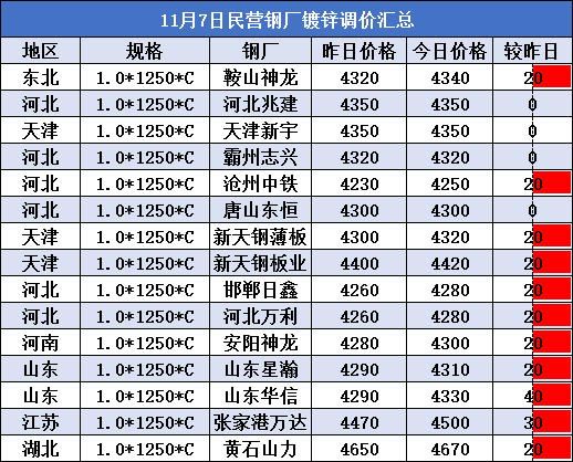 11月7日安阳神龙镀锌板出厂价格上调20元