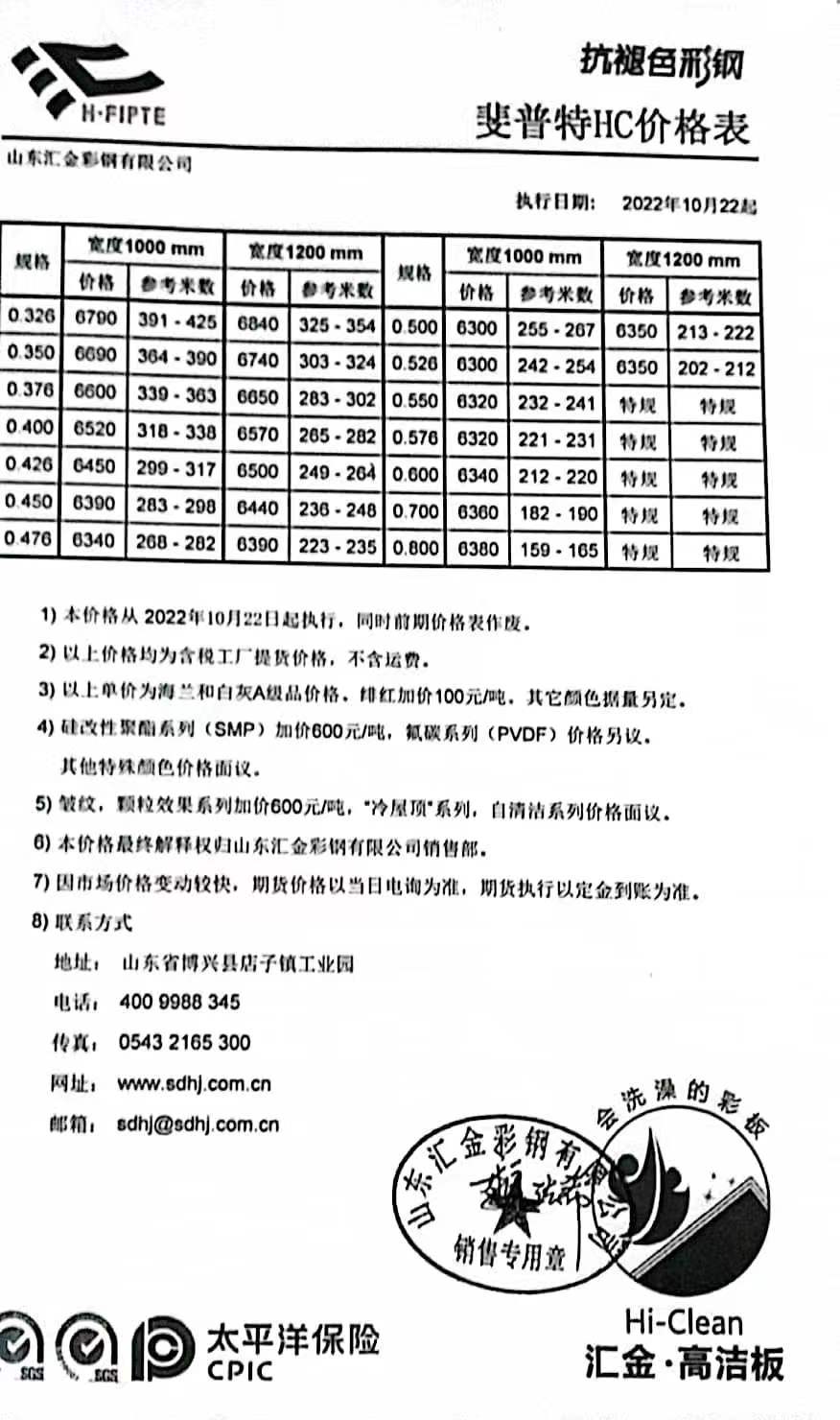 山东汇金斐普特彩钢价格销售表(11月9日)