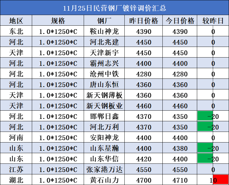 11月25日邯郸日鑫镀锌板出厂价格下调20元