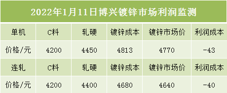 1月11日博兴镀锌市场利润监测