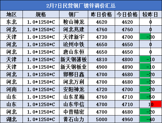 2月7日民营钢厂镀锌调价汇总