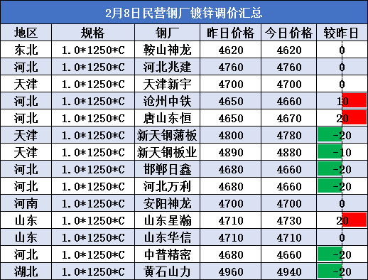 2月8日民营钢厂镀锌调价汇总