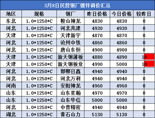 3月8日天津新天钢板业无花镀锌板出厂价格上调10元