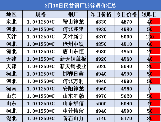 3月10日天津新天钢薄板镀锌出厂价格上调40元