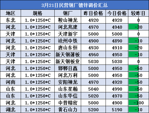 3月21日民营钢厂镀锌调价汇总
