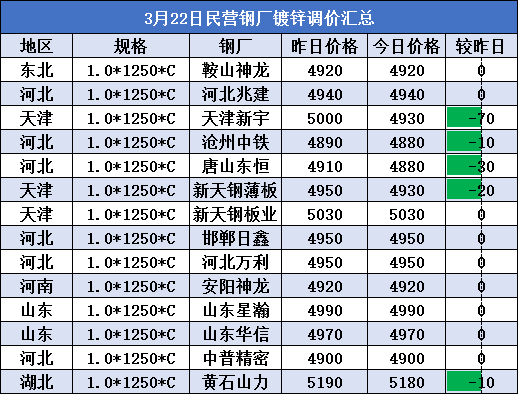 3月22日民营钢厂镀锌调价汇总