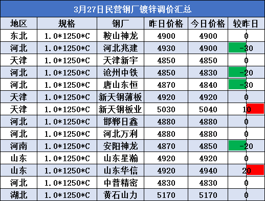 3月27日(11:20)唐山东恒有花镀锌板出厂价格上调10元
