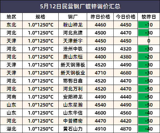 • 5月12日中普精密镀锌板出厂价格下调50元