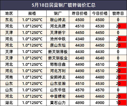 • 5月18日唐山东恒有花镀锌板出厂价格上调20元