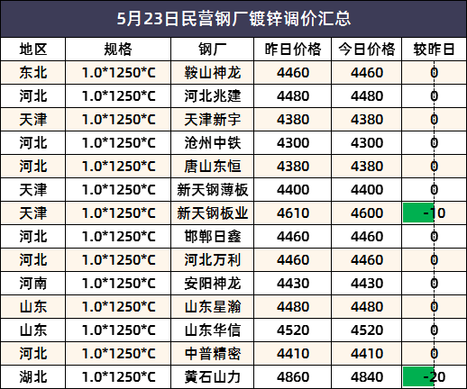 • 5月23日天津新天钢板业无花镀锌板出厂价格下调10元