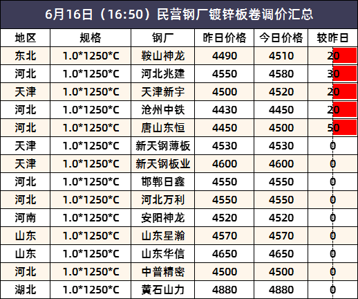 6月16日(16:50)民营钢厂镀锌板卷调价汇总