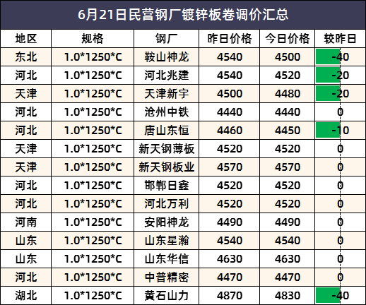 • 6月21日民营钢厂镀锌板卷调价汇总