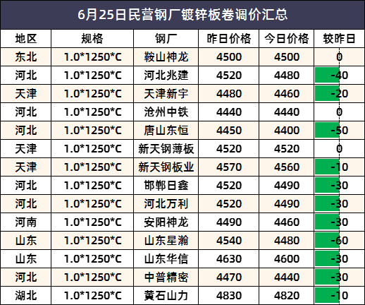 6月25日民营钢厂镀锌板卷调价汇总
