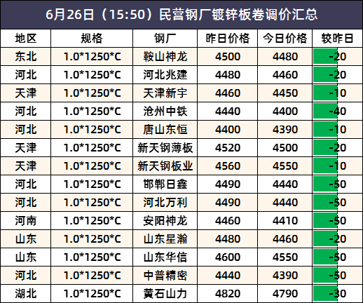 • 6月26日(15:50)民营钢厂镀锌板卷调价汇总
