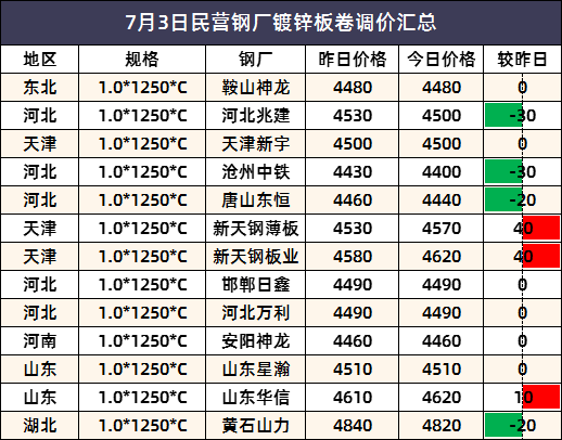 • 7月3日民营钢厂镀锌板卷调价汇总
