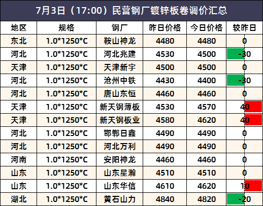 7月3日(17:00)民营钢厂镀锌板卷调价汇总
