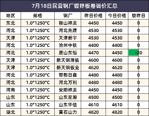 • 7月18日民营钢厂镀锌板卷调价汇总