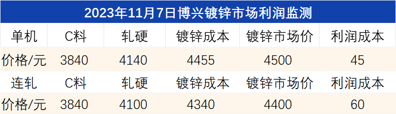 11月7日博兴镀锌市场利润监测