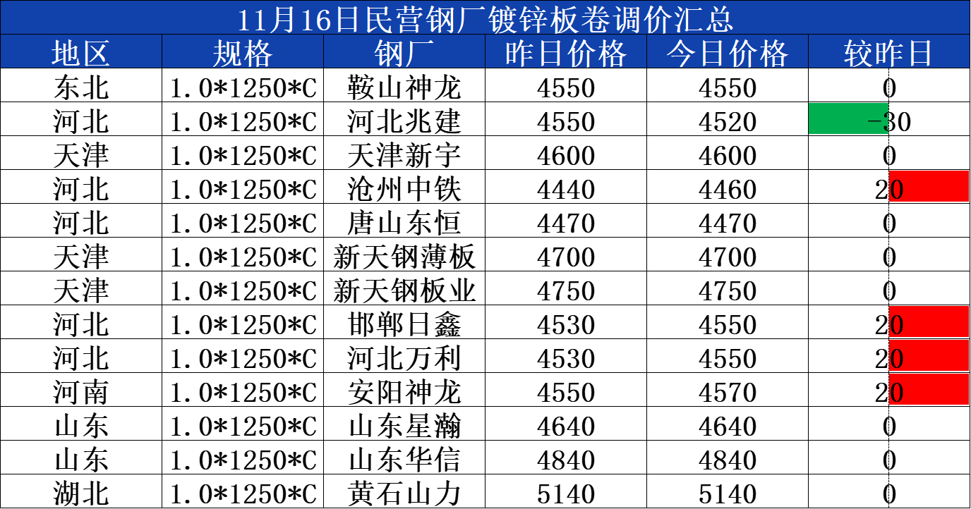 • 11月16日民营钢厂镀锌板卷调价汇总