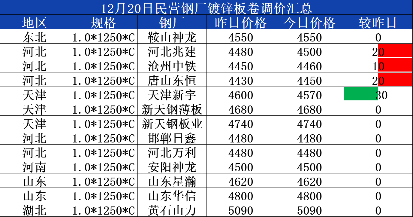 • 12月20日民营钢厂镀锌板卷调价汇总