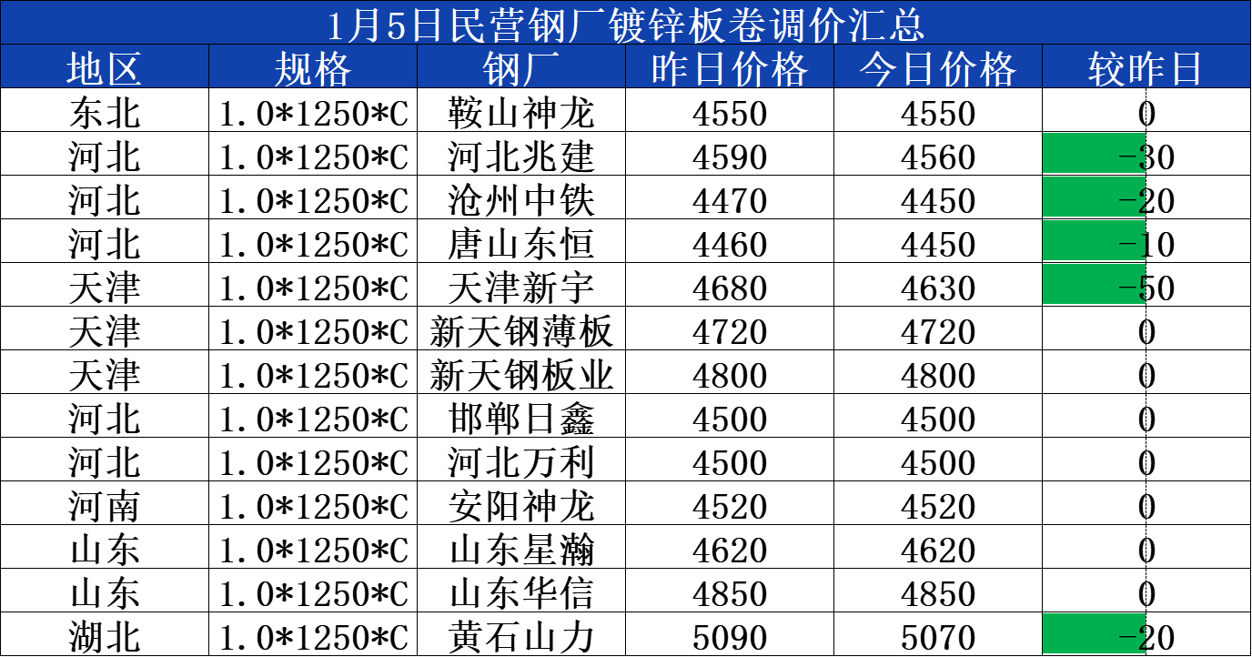 • 1月5日民营钢厂镀锌板卷调价汇总