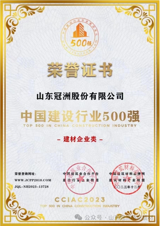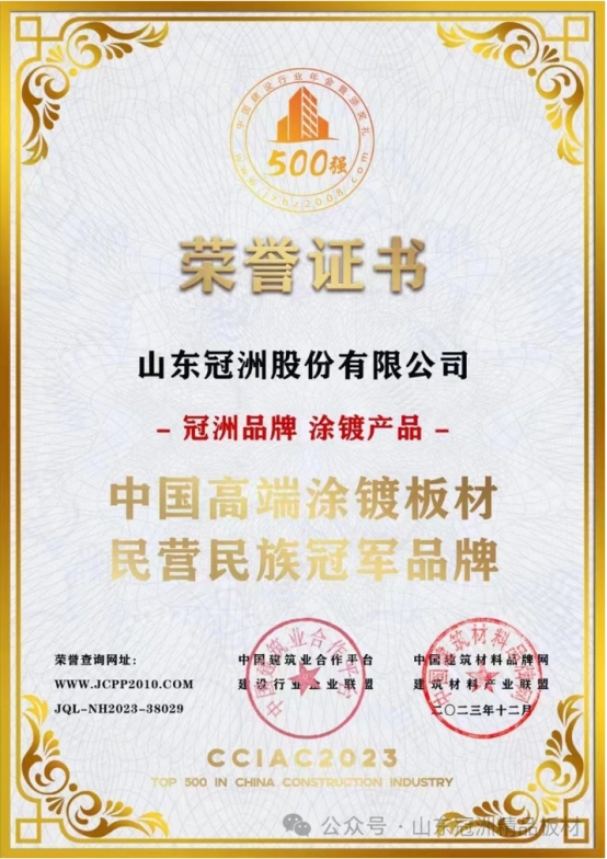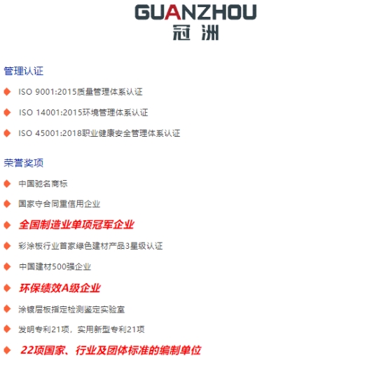 彩涂板定制领跑者 | 冠洲荣获中国高端涂镀板材民营民族冠军品牌、中国建设行业500强