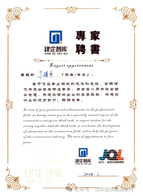 王总和丁总监还参加了全国基础设施建设与材料设备专家智库座谈会,丁建平总监被聘请为建企智库特邀专家。同时,大会还为冠洲颁发了《中国高端涂镀板材民营民族冠军品牌》和《中国建设行业500强》荣誉证书。