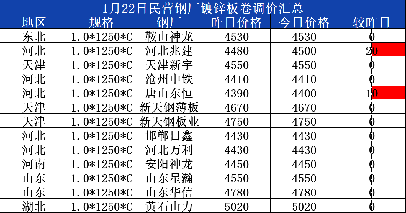 • 1月22日民营钢厂镀锌板卷调价汇总